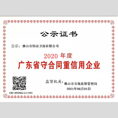 獎 項:2020年度廣東省“重合同守信用”企業 ——恒潔衛浴集團