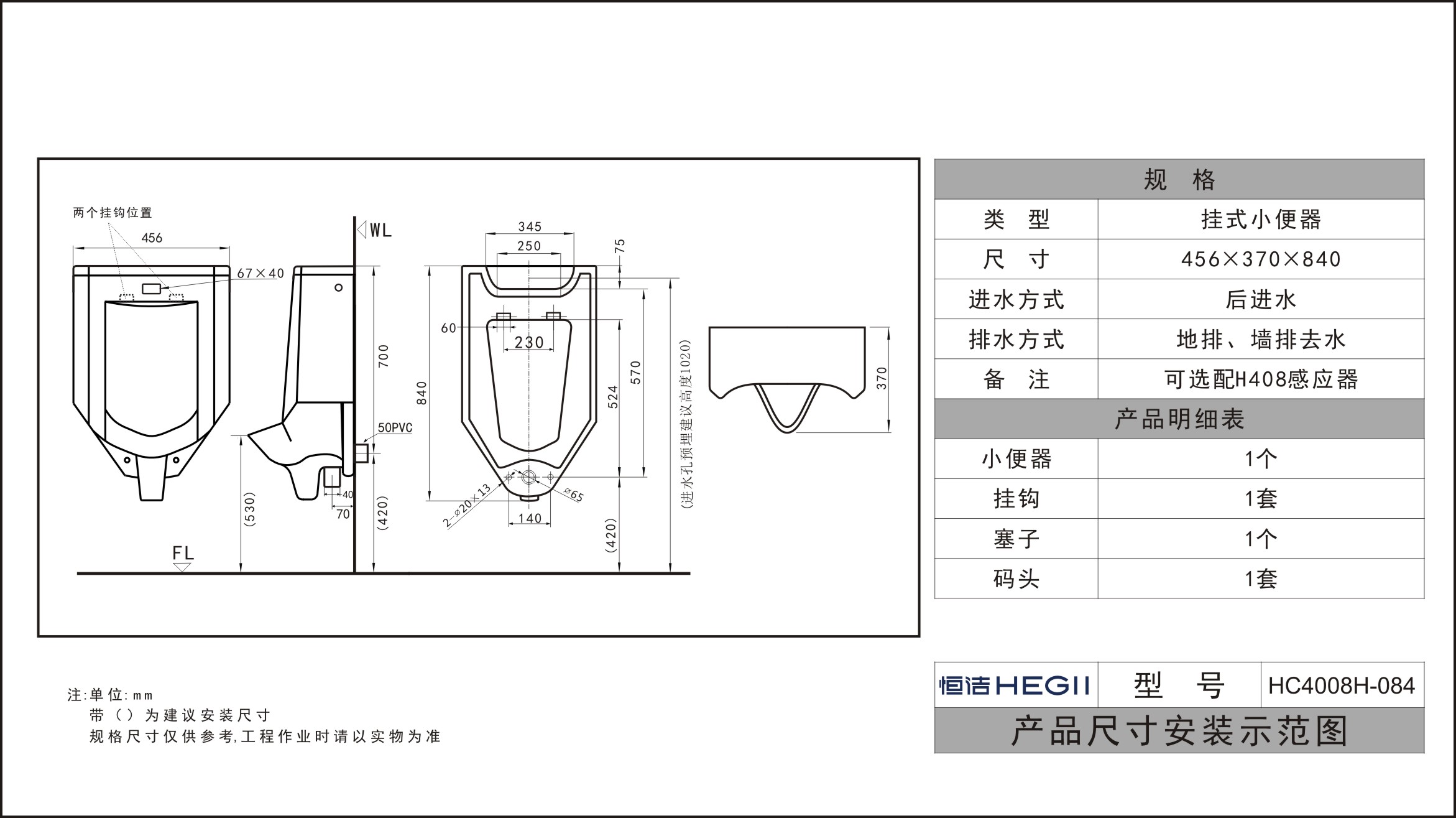 HC4008H-084一體感應掛式小便斗